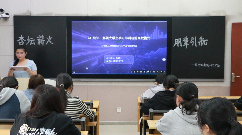朋辈导师于成爽以“AI+统计:解锁大学生学习与科研的高效模式”为题,聚焦学生学习科研中的难点痛点,通过典型案例讲解与现场实操演示,介绍AI技术在数据处理、文献梳理、模型构建、论文撰写等环节的应用路径,传授SPSSAI版、AutoML、AskManyAI等工具的使用技巧,帮助同学们树立“专业为本、AI赋能”的科学理念,熟练掌握AI助力学习科研的完整流程与注意事项。