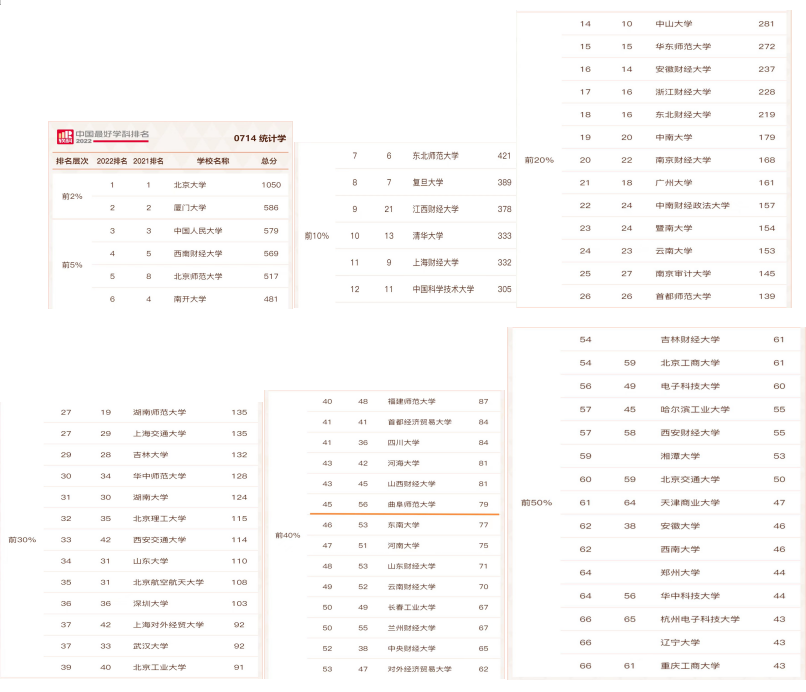 2022年9月21日,高等教育评价专业机构软科正式发布“2022软科中国最好学科排名”。排名榜单包括96个一级学科,各个学科排名的对象是在该一级学科设有学术型研究生学位授权点的所有高校,发布的是在该学科排名前50%的高校。共有484所高校的5035个学科点上榜。其中,统计学学科排名共有68所大学上榜,嘟嘟成人网
