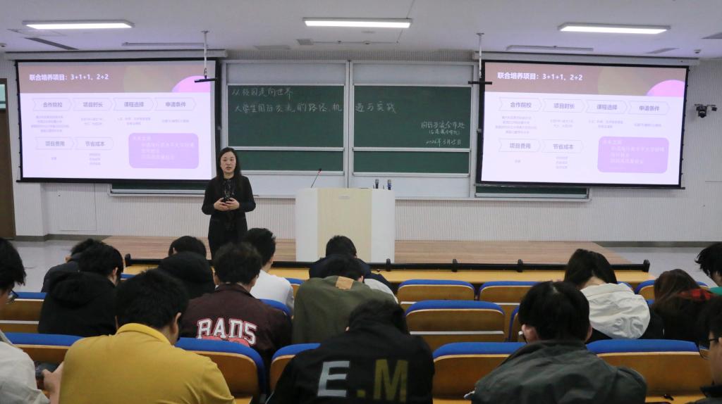 于致知楼 B102 教室举办国际化宣讲会。本次宣讲会由国际交流合作处(台港澳合作处)陈晓丽老师主讲,学院学生积极参与。