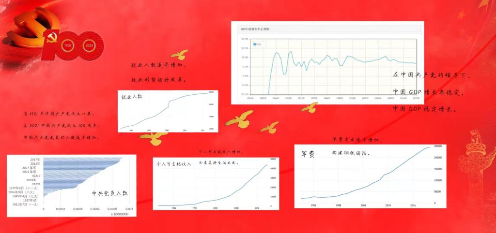 比赛规定,选手以个人为单位采用网络投稿的方式参赛,要求比赛作品应体现中国共产党的伟大奋斗历程这个主题。比赛期间,统计学社学术研究部积极为参赛选手提供相应的帮助,认真回答选手提出的问题,同时也邀请老师为参赛选手进行学术上的指导。在比赛过程中,同学们积极参与,查阅大量与党史相关的文字资料和数据资料,运用统计学技能将其整合,不断追求作品在形式、内容等各方面完整、新颖。在比赛后期作品评比过程中,各位指导老师与统计学社活动策划人员秉持公平公正的原则对入围作品进行评审打分,并将优秀作品进行校内展示宣传,让全校同学们加深了对党史的理解,体会到了数据的重要性。
