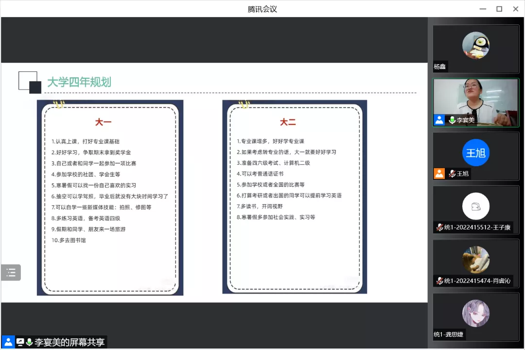 的教学以及考研优势,细心汇总了新生们常出现的问题,有利于同学们消除紧张与疑惑,快速适应大学生活。李宴美老师则以大学四年学业规划为切入点对同学们进行指导。李老师提出了大学四年提前进行规划,及时完成每个阶段的任务。最后,老师向同学们详细介绍了入党、竞赛、奖学金、学生会等事宜,丰富了学生对大学生活的认知,也对同学们的能力与素质提出了更高的要求。