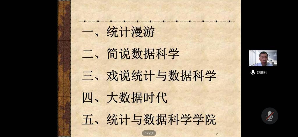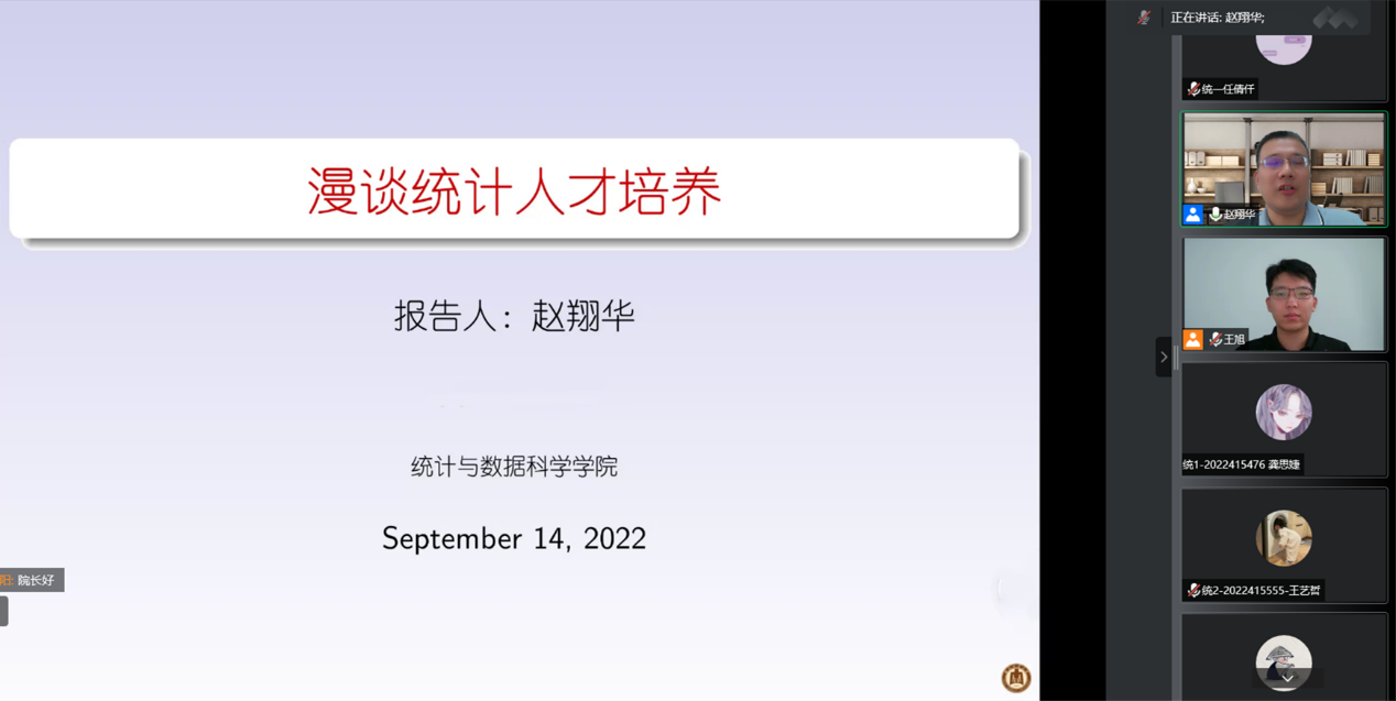 于9月13日、14日于召开线上专业学习教育会议。会议包括对统计与数据科学专业的讲解、学科专业教育和科技竞赛宣讲三个部分,分别由赵胜利院长、赵翔华副院长和王少新老师讲解。