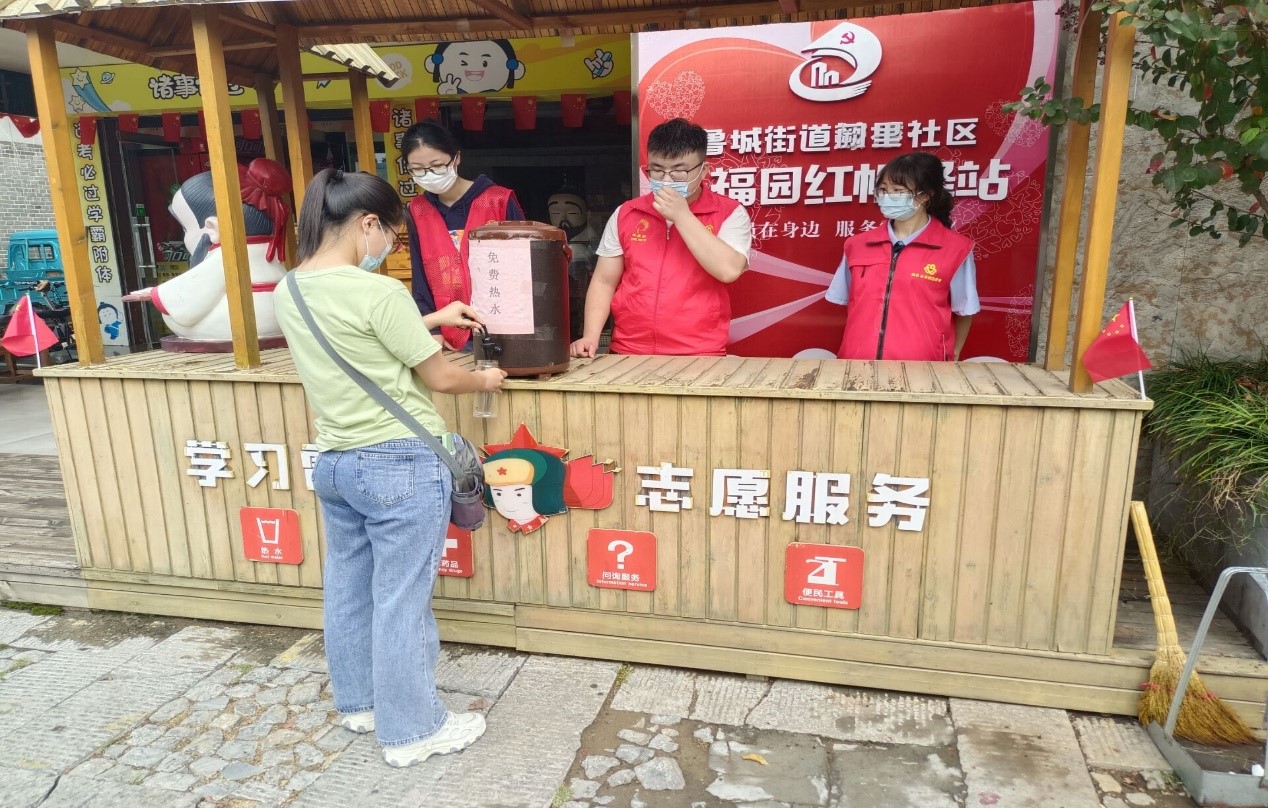 活动前,志愿服务部和社区工作人员按照防疫要求,对志愿者进行体温检测、查验健康码等防疫工作。活动中,志愿者们积极展现个人服务热情,对红帆驿站卫生进行清扫、开展社区各项防疫工作,还为来曲阜游玩的游客提供免费咨询和茶水服务。最后,活动在《我和我的祖国》的优美歌声中顺利结束。