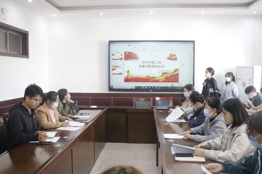 会议伊始,全体成员唱国歌。随后,李宴美同志向参会人员说明了会议流程并确定了发展对象的条件及相关要求。接着,培养联系人逐个介绍了尹董雨、杨冬敏、刘佳宁、祝春芳、胡明珠、连秀娟、苏筱艺、邵逸飞、王照吉、袁金霄10位入党积极分子的基本情况,他们在思想政治学习等方面锐意进取,思想进步,在日常生活和工作中严格要求自己,勇于开展批评和自我批评,自觉遵守国家法律法规以及学校的各种规章制度,有良好的道德修养,积极参加学校组织的各种活动,并作出良好表率。最后,在场群众依次发表意见,党员填写党员意见表后李宴美同志宣布投票结果,参会群众一致同意尹董雨、杨冬敏、刘佳宁、祝春芳、胡明珠、连秀娟、苏筱艺、邵逸飞、王照吉、袁金霄10位入党积极分子发展为发展对象。
