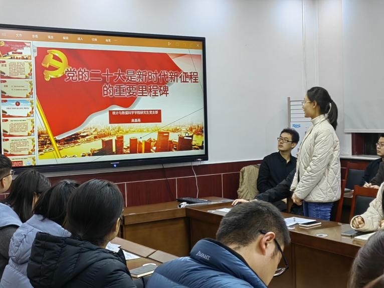 高鑫雨围绕党的二十大是新时代新征程的重要里程碑展开带领大家展开深入学习。她介绍道:中国共产党用伟大奋斗创造了辉煌伟业,十年来,以习近平同志为核心的党中央统筹中华民族伟大复兴战略全局和世界百年未有之大变局,团结带领全党全军全国各族人民有效应对严峻复杂的国际形势和接踵而至的巨大风险挑战,以奋发有为的精神把新时代中国特色社会主义不断推向前进。我们要不忘初心,带着梦想稳步前进,为全面建设社会主义现代化国家、全面推进中华民族伟大复兴而团结奋斗,奋力谱写新时代中国特色社会主义更加绚丽的华章!