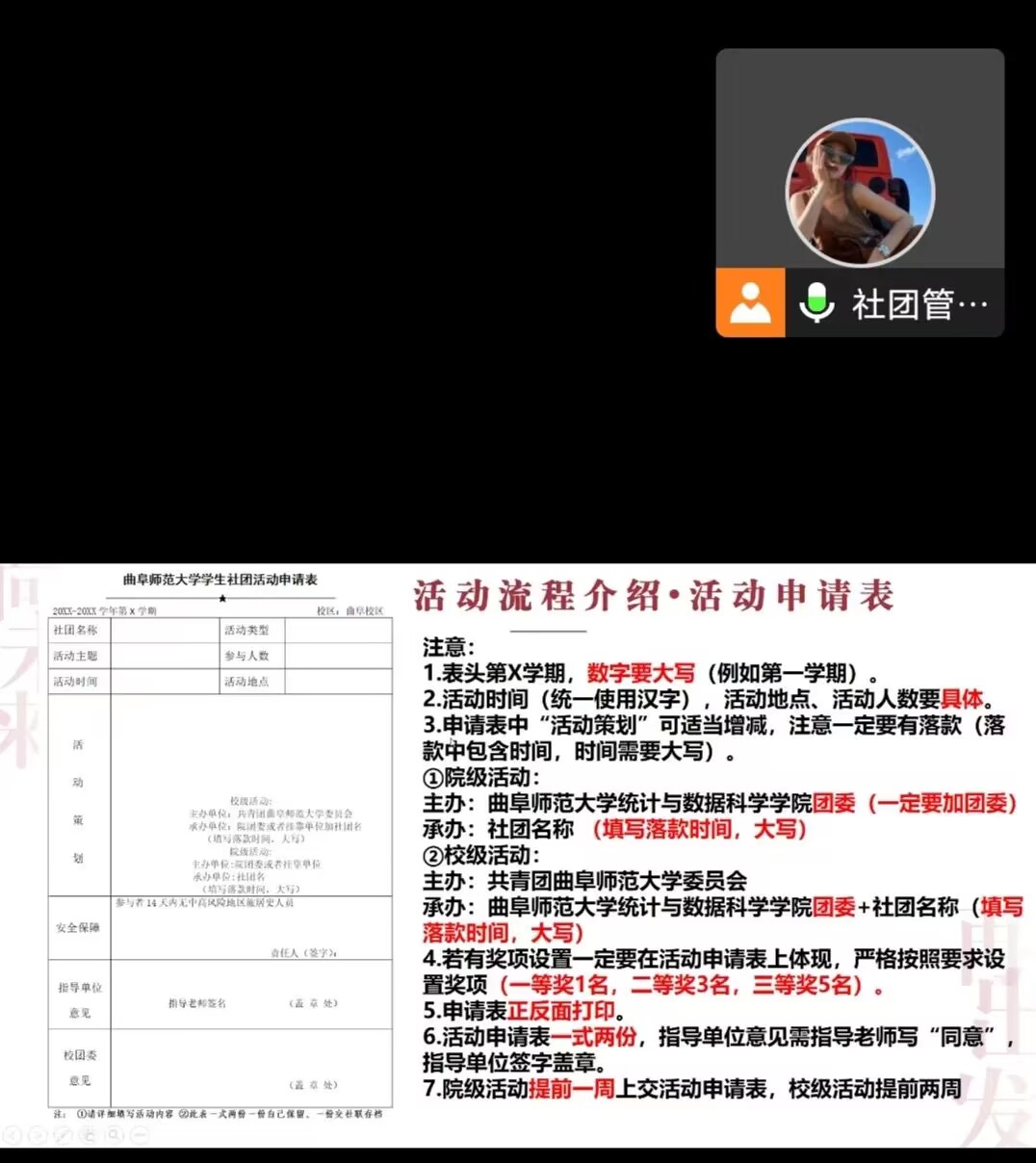会议伊始,社团管理部成员带领参会人员学习党的二十大的相关内容,展示二十大主题、学习内容及启示意义。随后,社团管理部部长对社团举办活动的具体流程和各项重要文件注意事项等重点问题进行讲解,带领大家学习社团管理制度。会议最后,各社团负责人积极提问,社团管理部负责人耐心解答,展现出学院社团成员认真负责的优秀品质。