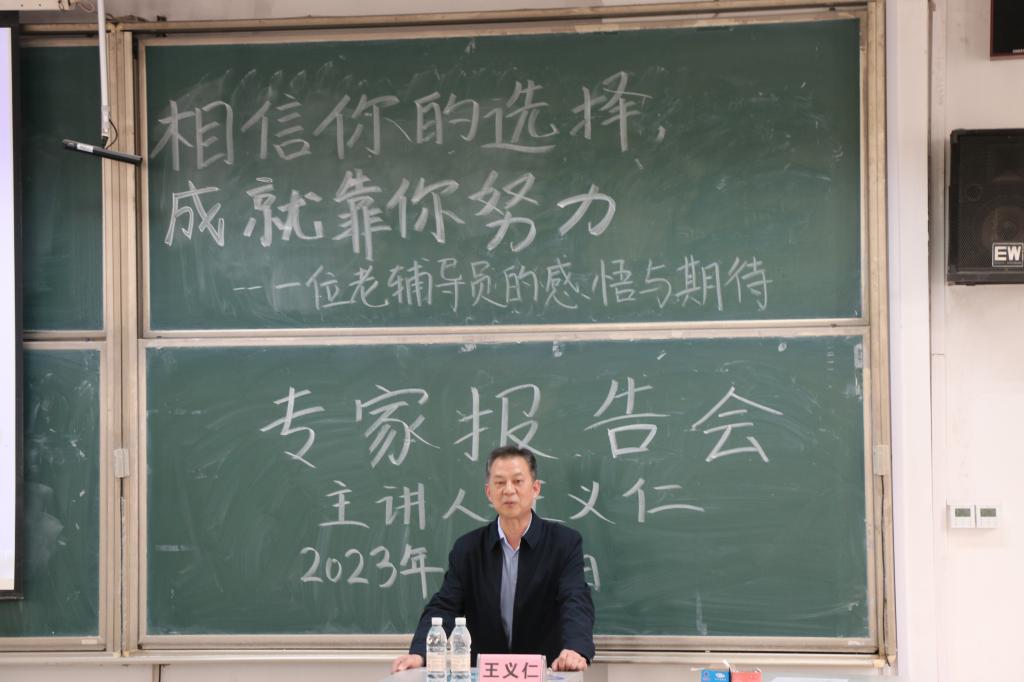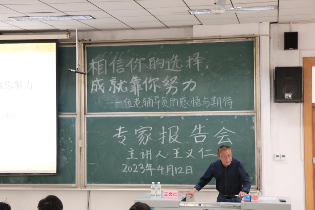 的发展历程,并结合文字资料和图片生动形象的讲述自身经历,指导学院学风建设。讲述过程中,王义仁老师从一名从业多年的资深辅导员角度对在场辅导员和参会学生进行经验传授和耐心教导,从品行要端正、确实要扎实、身体要强壮和目标要明确四个方面强调大学生应德智体美劳全面发展,鼓励同学们要培养自我约束力以及分析问题和解决问题的能力,争取将规划的目标落到实处。从王老师风趣幽默、内容详实的报告中,在场老师和学生深受启发,对接下来的工作和学习有了更加清晰的目标。会议最后,季中书记进行总结发言,希望同学们今后在各方面严格要求自己,充分利用学校资源,对自己的未来负责,度过精彩而有意义的大学生活。