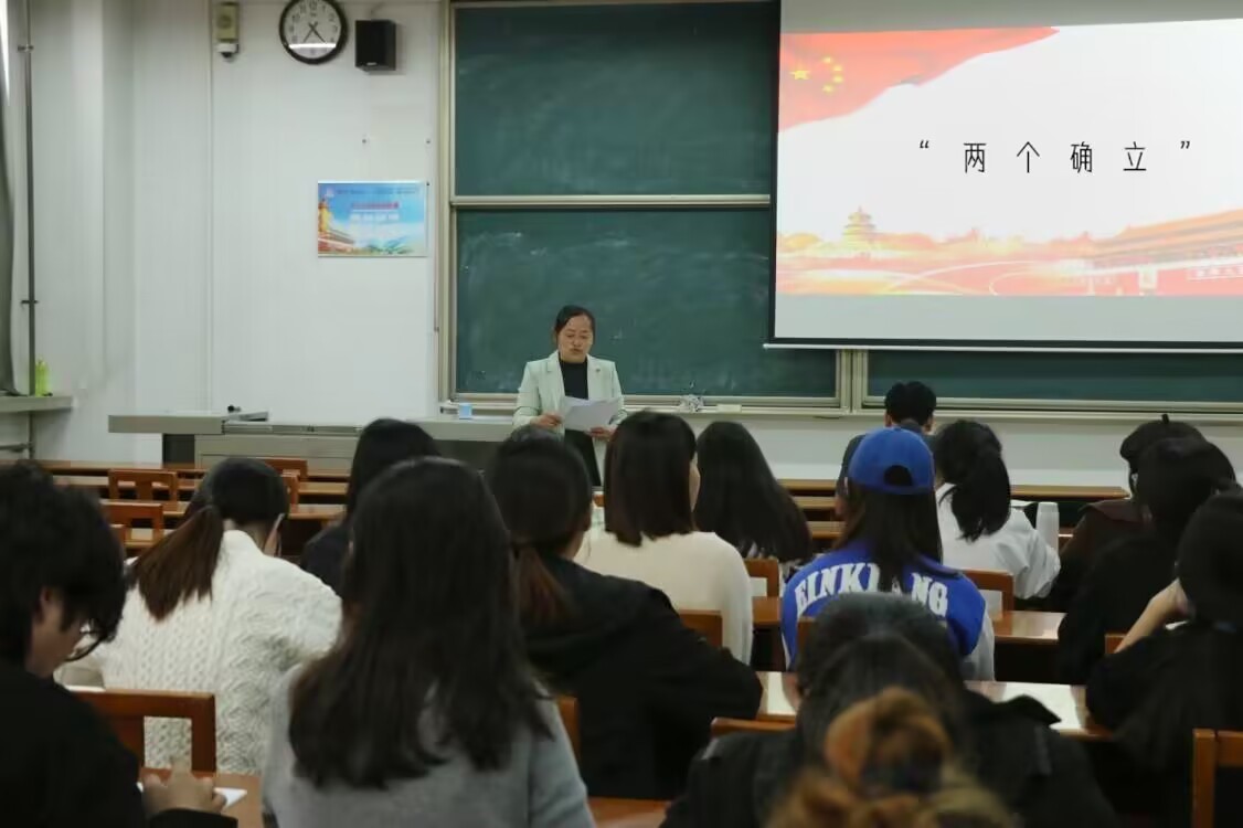 “两个确立”是党的十八大以来最重要的政治成果,“两个确立”是时代呼唤、历史选择、民心所向,具有强大的历史穿透力、文化感染力和精神感召力,蕴含理论必然、实践必然、历史必然和党自身建设必然。李宴美老师指出迈向新征程,全体同学深刻领悟“两个确立”的决定性意义,坚定信心,奋勇前进。