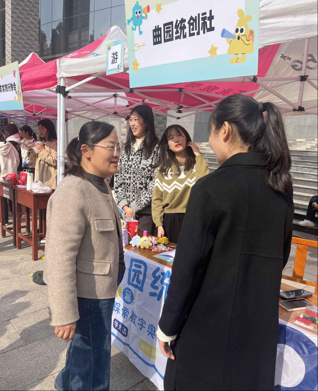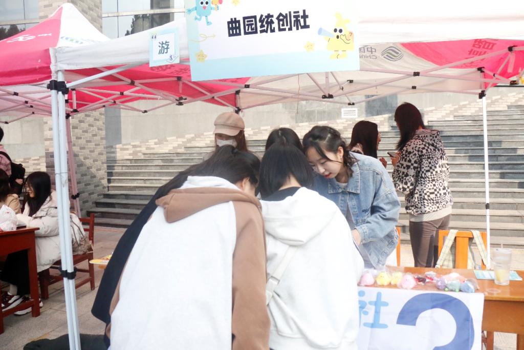 于 11 月 3 日在大学生活动中心前举办百团大战——社团纳新活动。曲园统创社、统计学社、家教协会面向全校同学招新,吸引了大批学生踊跃报名,学院团委书记李宴美来到现场为嘟嘟成人网