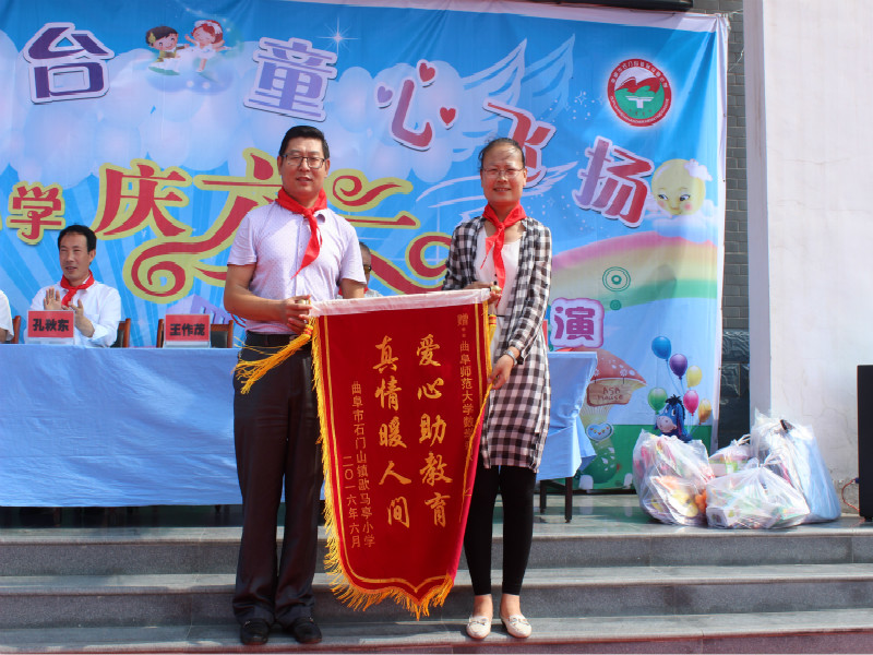 师生在本次活动中给贫困孩子捐赠了包括书包、文具等很多学习用品,歇马亭小学郝丽珍校长带领受资助学生代表对嘟嘟成人网