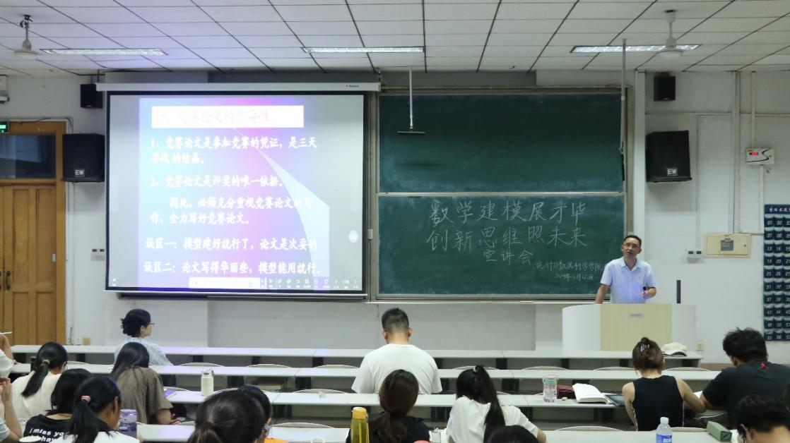 于6月12日晚在综合楼101教室举办主题为“数学建模展才华,创新思维照未来”宣讲会。会议邀请学院陈志成老师作报告指导,2022级、2023级学生们积极参加。
