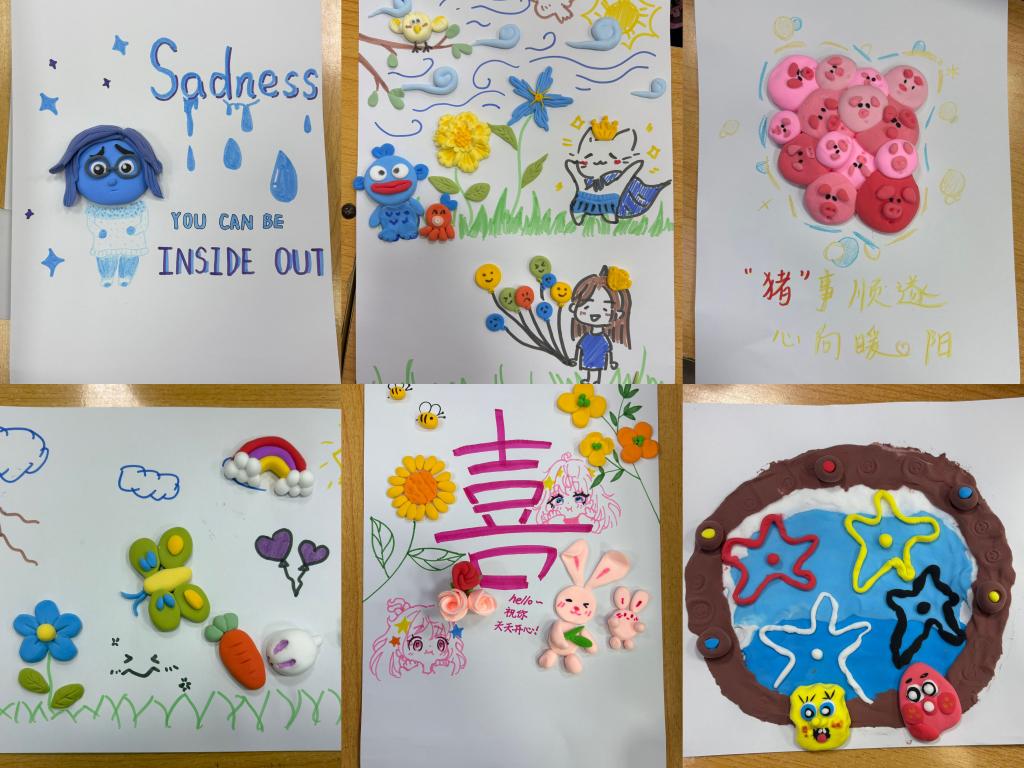活动开始,主持人营造轻松氛围引导学生融入。接着,学生通过桌上摆放的各色粘土、塑形工具和参考素材,围绕“情绪”主题捏制可爱造型或大胆尝试抽象创作,其间学生们互动交流。