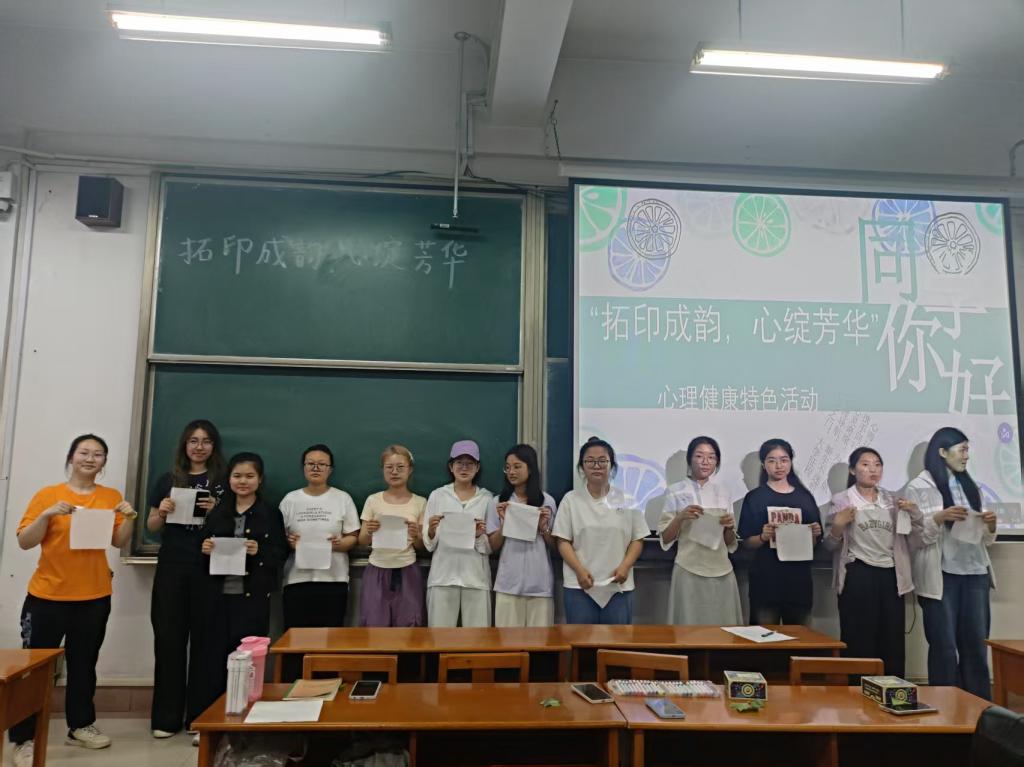 于2025年5月18日,精心策划并举办了“拓印成韵,心绽芳华”心理健康特色活动,全体本科生积极参与本次活动。