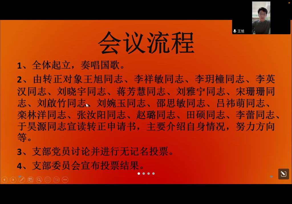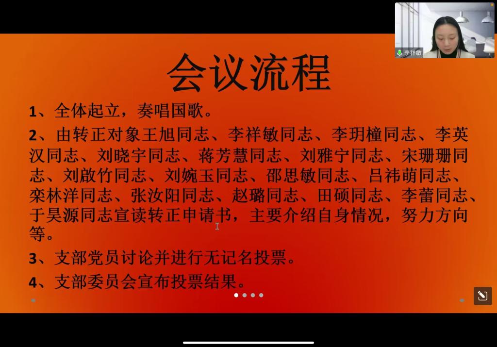 会议的主题是讨论王旭、李祥敏、李玥橦、李英汉、刘晓宇、蒋芳慧、刘雅宁、宋珊珊、刘啟竹、刘婉玉、邵思敏、吕祎萌、栾林洋、张汝阳、赵璐、田硕、李蕾、于昊源十八名同志转为正式党员的申请。本次会议严格按照转正流程进行,第一,全体起立,奏唱国歌,由王旭、李祥敏、李玥橦等十八名转正对象宣读转正申请书,主要介绍了自身情况,并且规划了成为中共党员后的努力方向;第二,本科生党支部党员讨论并进行无记名投票,大会一致同意王旭、李祥敏、李玥橦等十八名预备党员成为正式党员;第三,王旭、李祥敏、李玥橦等十八名预备党员进行宣誓;第四,嘟嘟成人网